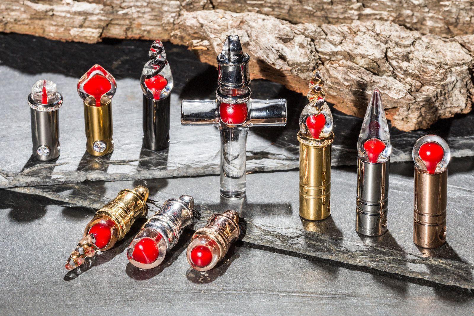 Jede der mundgeblasenen Kristallphiolen, in der ein Tropfen Blut versiegelt wird, ist ein Unikat und wird in einem edlen Schmuck gefasst.